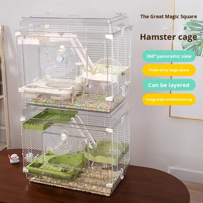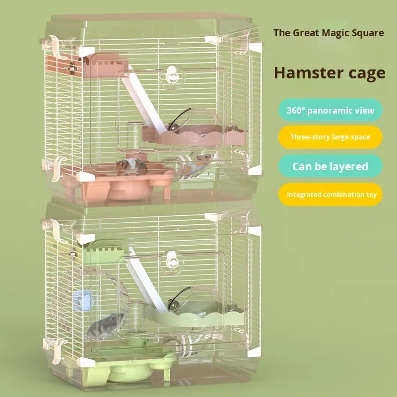 Cage à hamster panoramique transparente à trois étages, de luxe, dorée, avec cadre en plastique, grande taille, pas chère, 48