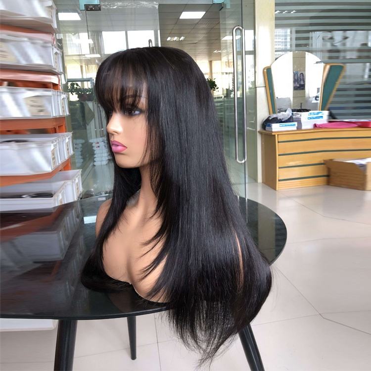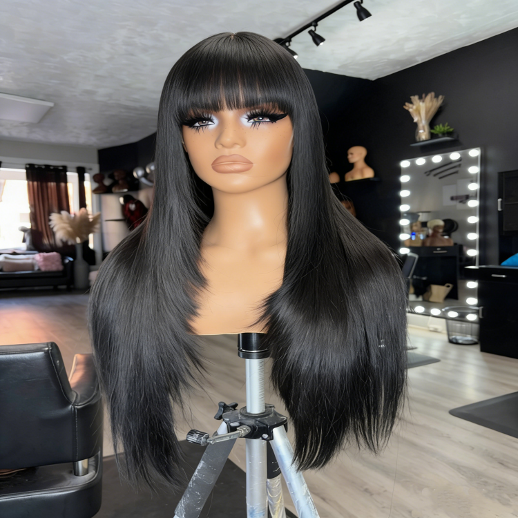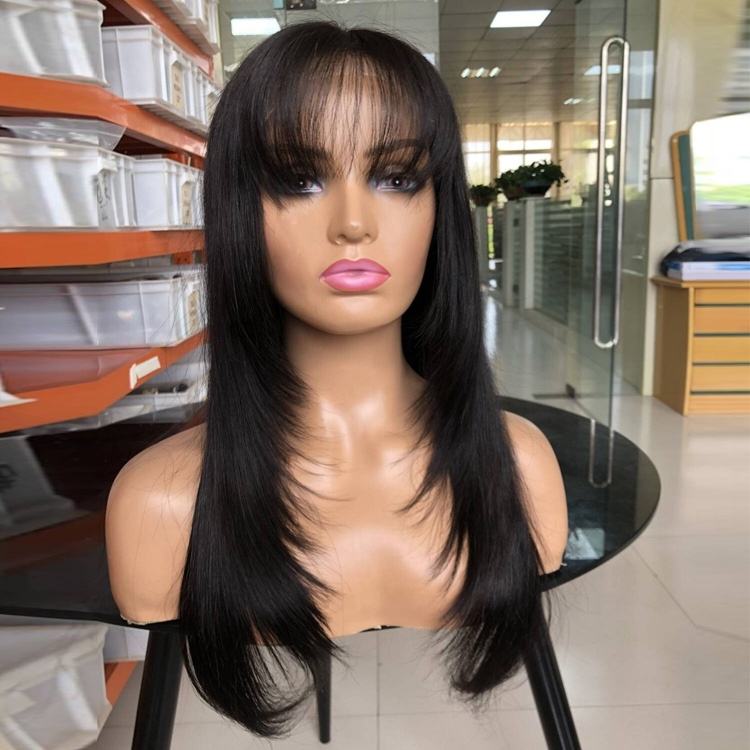 Perruque en dentelle 5x5 sans colle, prête à porter, avec frange, coupe dégradée, en cheveux naturels