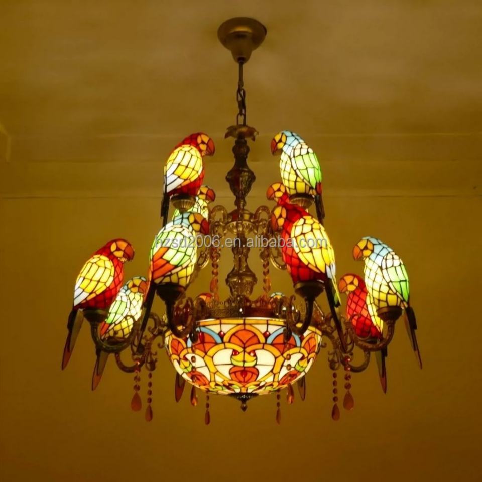 Lampe suspendue multi-têtes Tiffany style rétro Asie du Sud-Est, design perroquet, corps doré, hauteur réglable, garantie 5 ans, éclairage