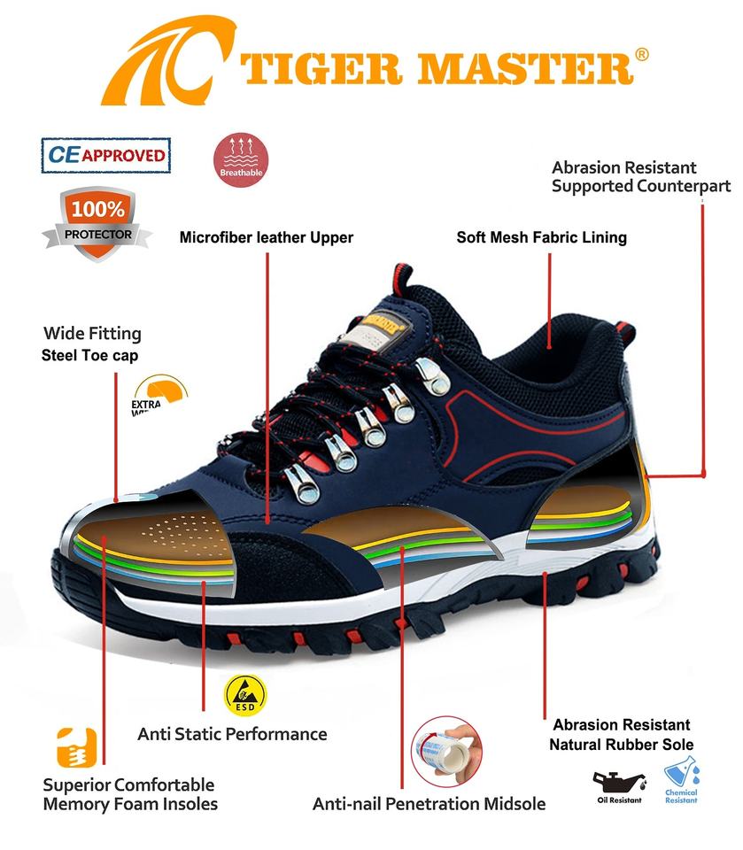 Chaussures de sécurité de travail pour hommes Tiger Master Blue en cuir microfibre antidérapant avec semelle en caoutchouc, embout en acier, anti-perforation pour la construction et les mines