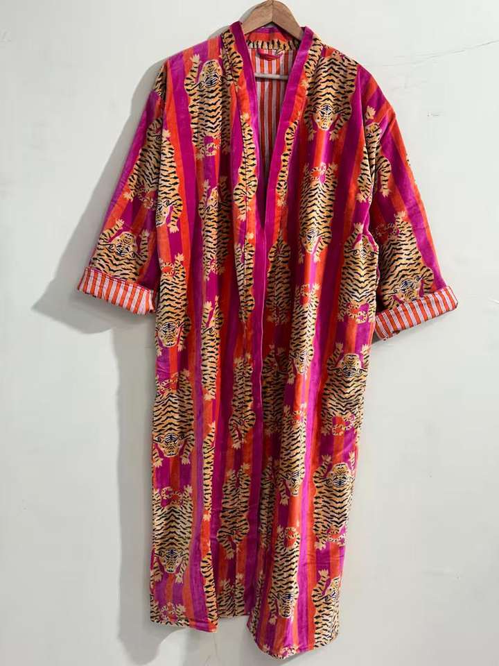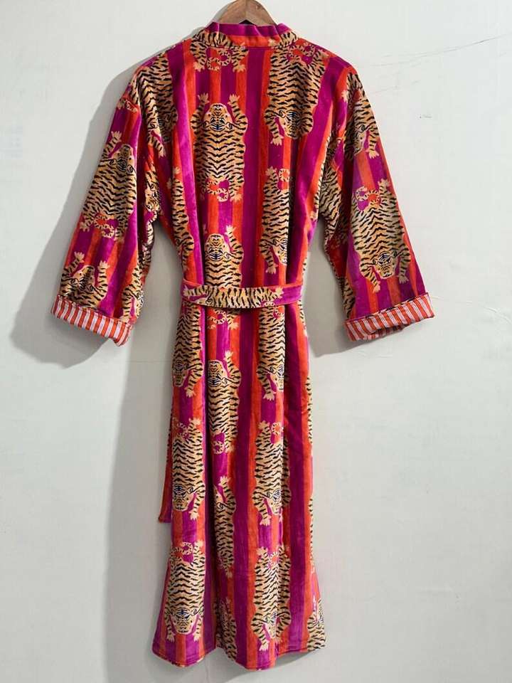 Robe kimono en velours imprimé tigre : Peignoir en velours de coton