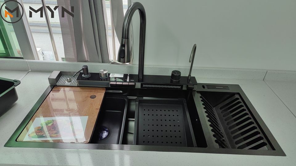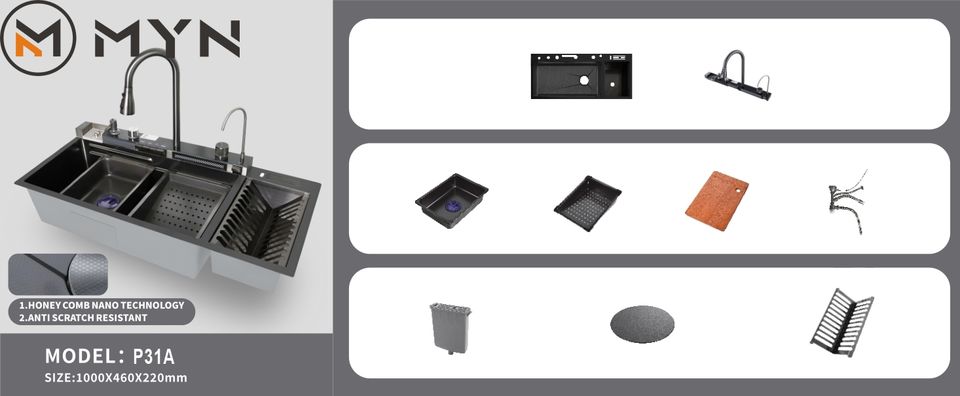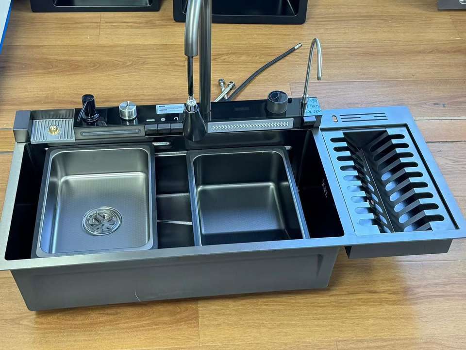 Évier de Cuisine Noir Bionique Nid d'Abeille, Grand 40 Pouces, en Acier Inoxydable, Deux Cuves, avec Robinet Cascade Monobloc – Nouvelle Tendance TikTok