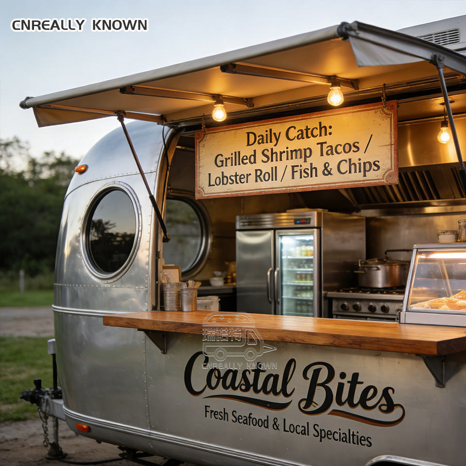 Remorque de cuisine mobile intemporelle et épurée, polie à la main, design rétro, homologuée DOT CE VIN, chariot de rue