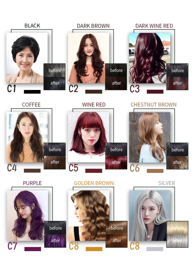 Couvre les cheveux gris, Cheveux blancs couverture, Couleur longue durée, Sans ammoniaque, Couleur vibrante, Sans peroxyde, Formule nourrissante, Formule non-goutte à goutte, Application facilePersonnages