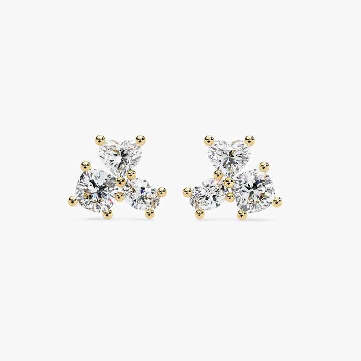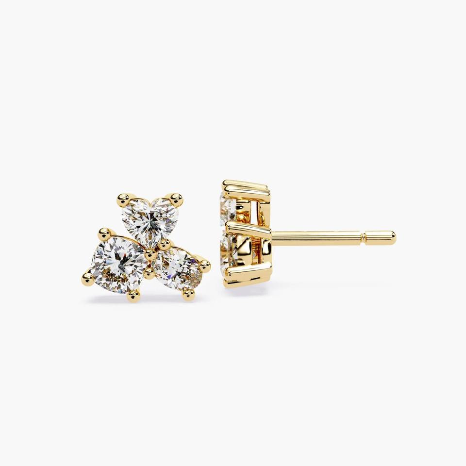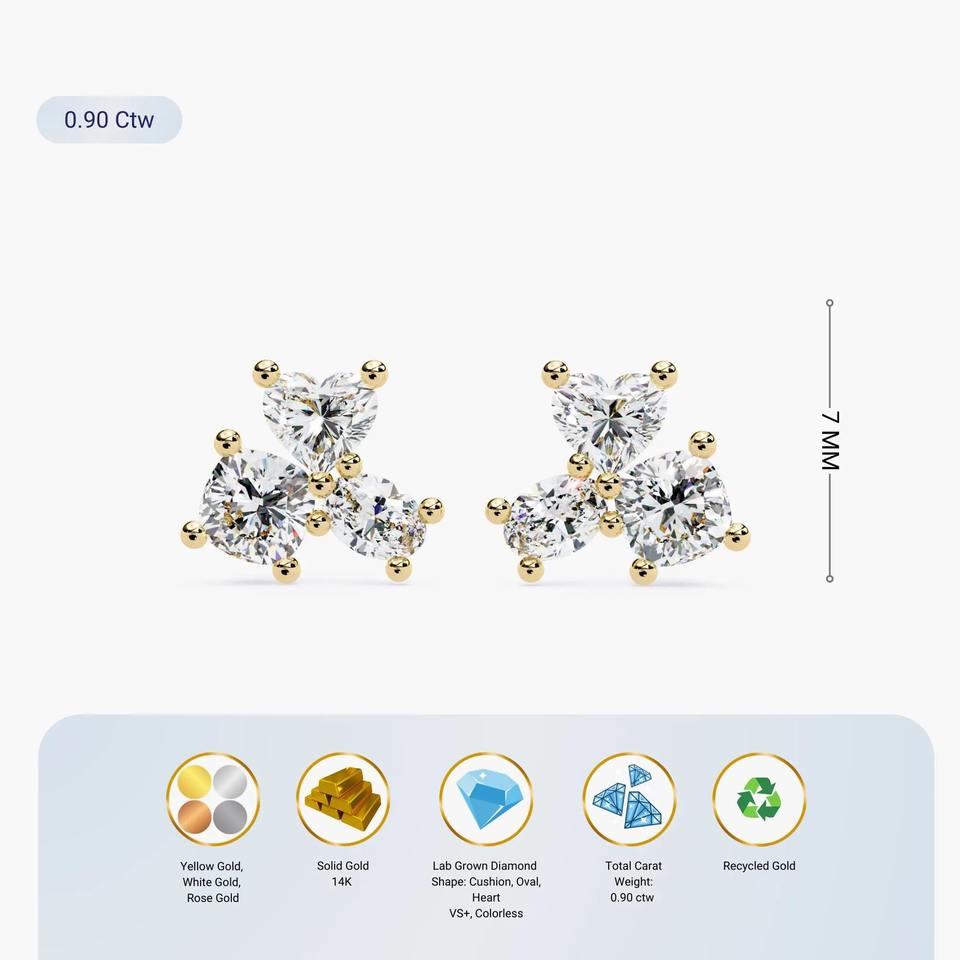Petites boucles d'oreilles clous en or massif 14 carats avec trio de diamants de laboratoire en forme de cœur de 0,90 ct, certifiées IGI, bijoux fins minimalistes pour cadeau et soirée