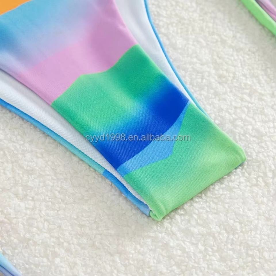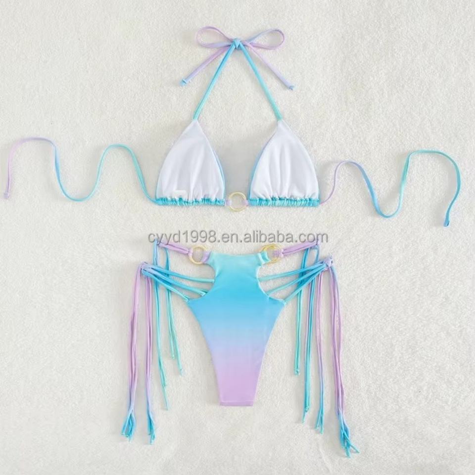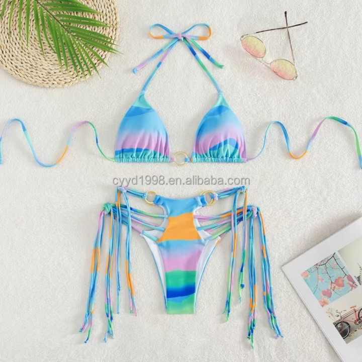 Mini bikini sexy au design unique, imprimé et à rayures, avec soutien-gorge push-up, pour la plage et la natation, accompagné d'un accessoire de plage à franges