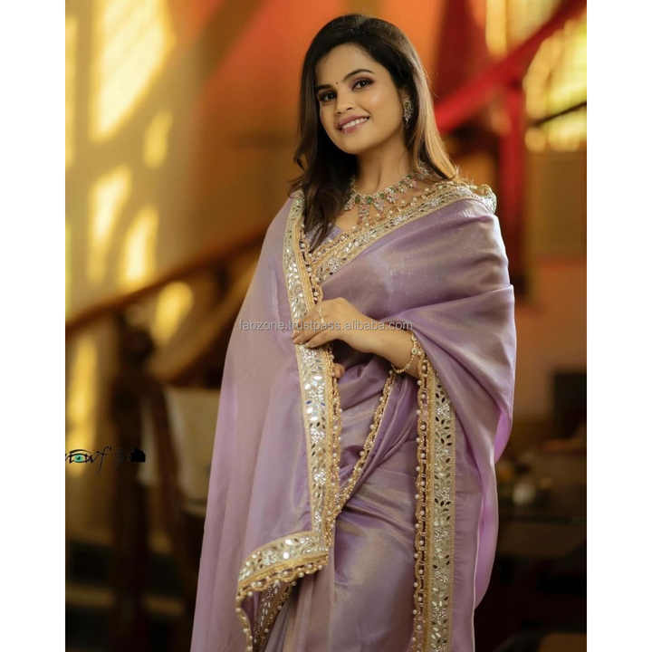 Tissu de soie Belle séquence et broderie avec miroir à main réel et saree à bordure en dentelle perlée
