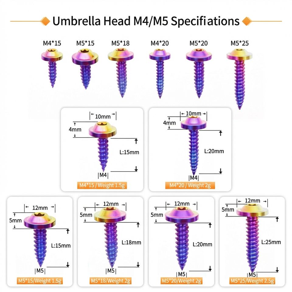 Vis autotaraudeuses à tête parapluie Torx en titane M4 M5, couleurs PVD anodisées, pour carénage de moto