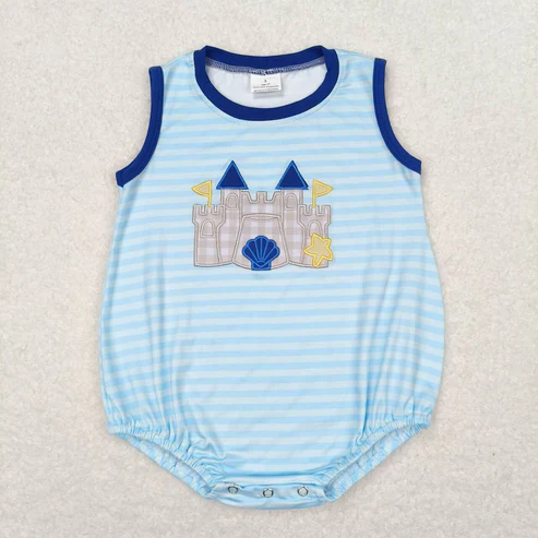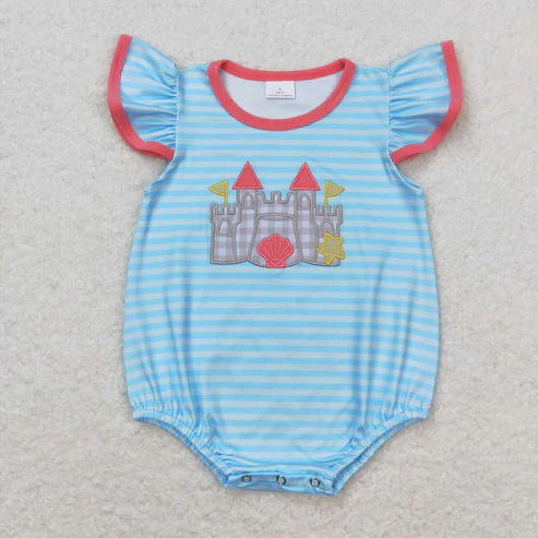 Ensemble assorti pour tout-petits, rayures bleu clair, broderie château de sable, éco-responsable, spandex/polyester, manches courtes