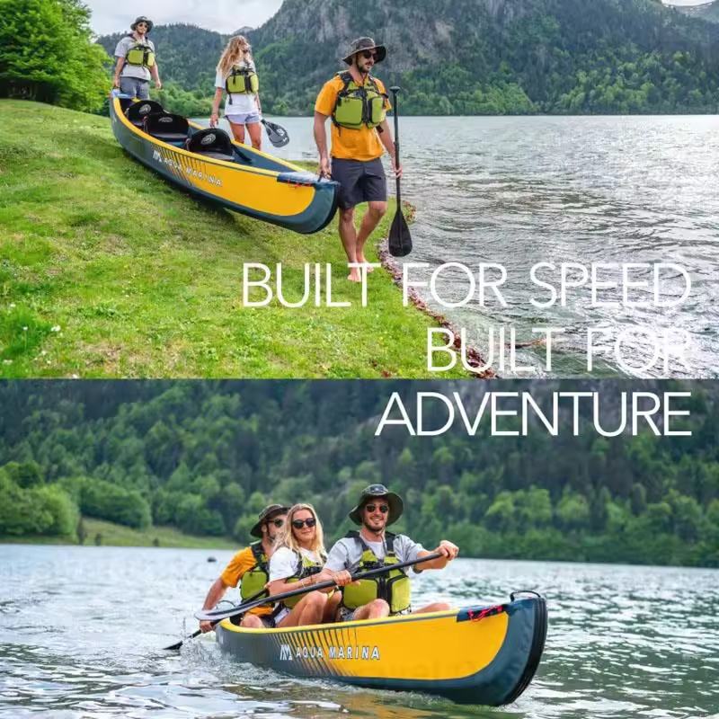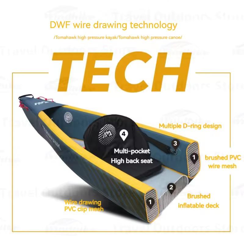 Canoë à trois places entièrement brossé à haute pression Tomahawk, équipé d'une pompe à air haute pression bidirectionnelle et d'un sac à dos à fermeture éclair