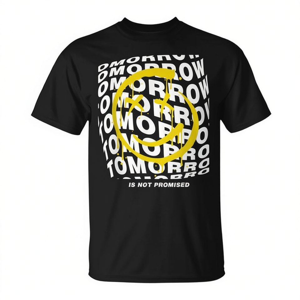 T-shirt Tomorrow Is Not Promised, noir et jaune, avec motif souriant, unisexe, taille adulte