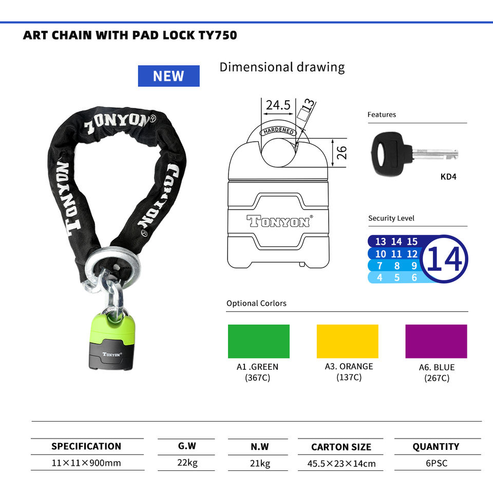 Serrures Tonyon ART 4 étoiles Anti-vol Vélo Haute sécurité Chaîne de verrouillage robuste Cadenas pour vélo Moto Chaîne de verrouillage