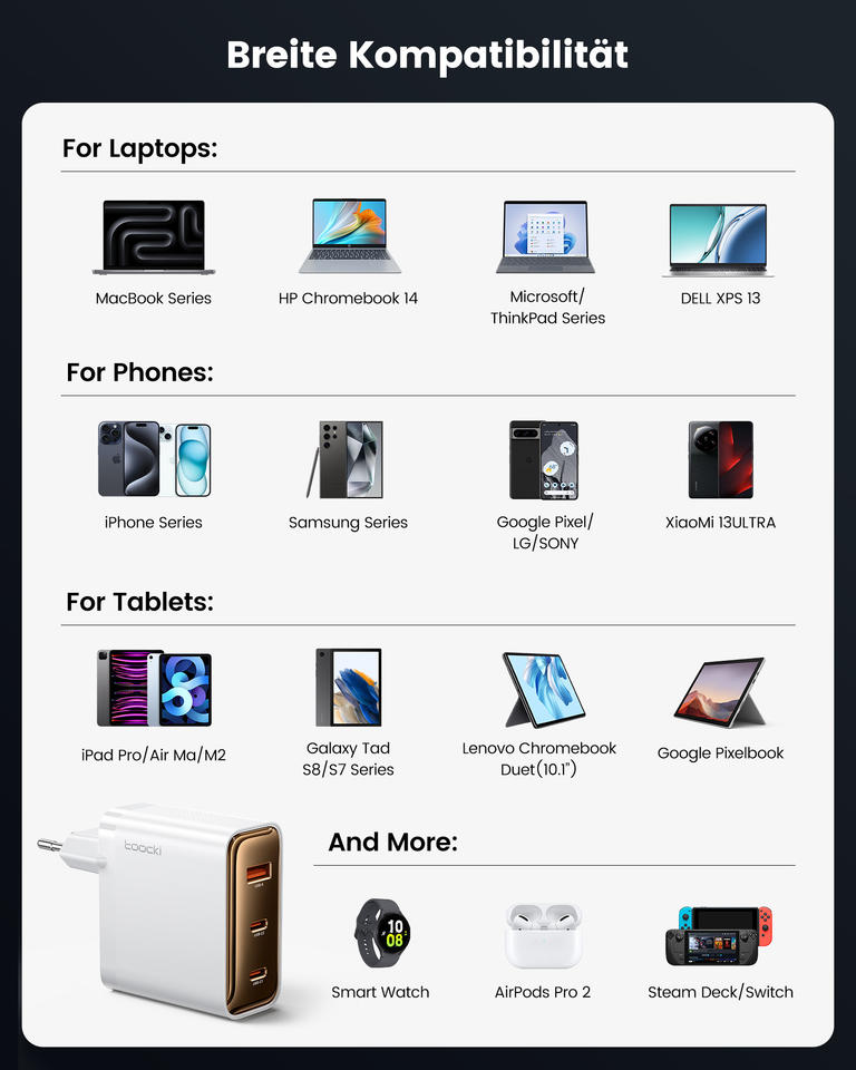 Toocki 100W chargeur GaN de bureau 3 ports USB C station de charge rapide avec distribution d'alimentation pour la charge multi-appareils