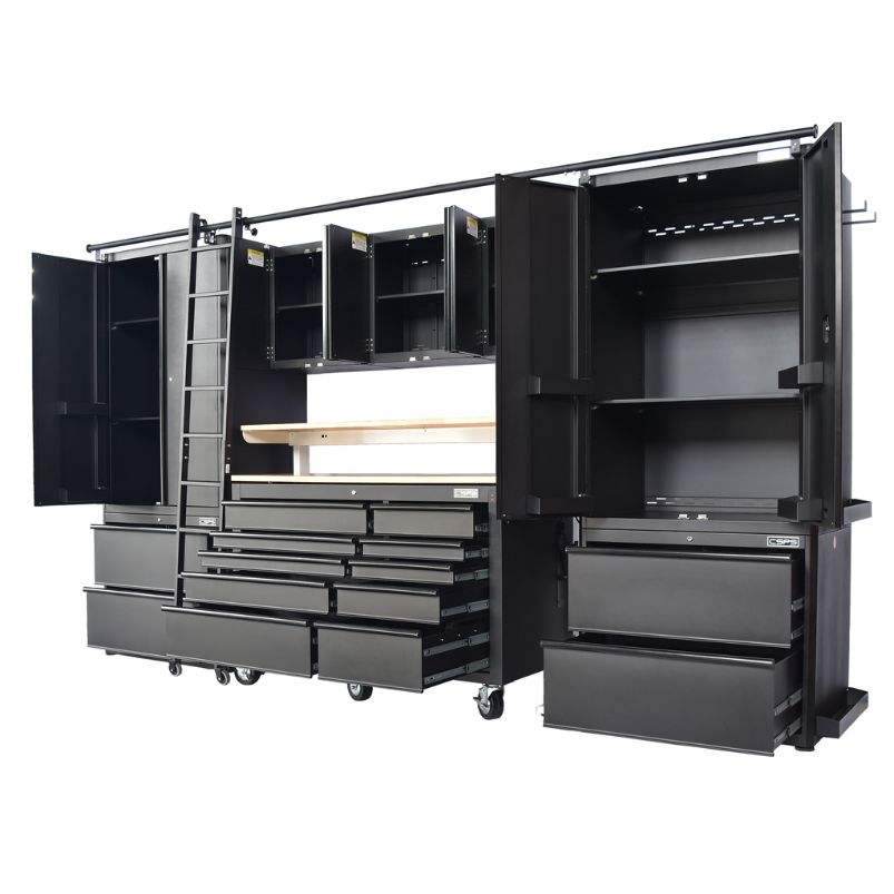 Ensemble d'armoires à outils Master 366 cm en acier thermolaqué, 14 tiroirs, antivol, certifié ISO9001, noir mat, certifié OEM, serrure à clé