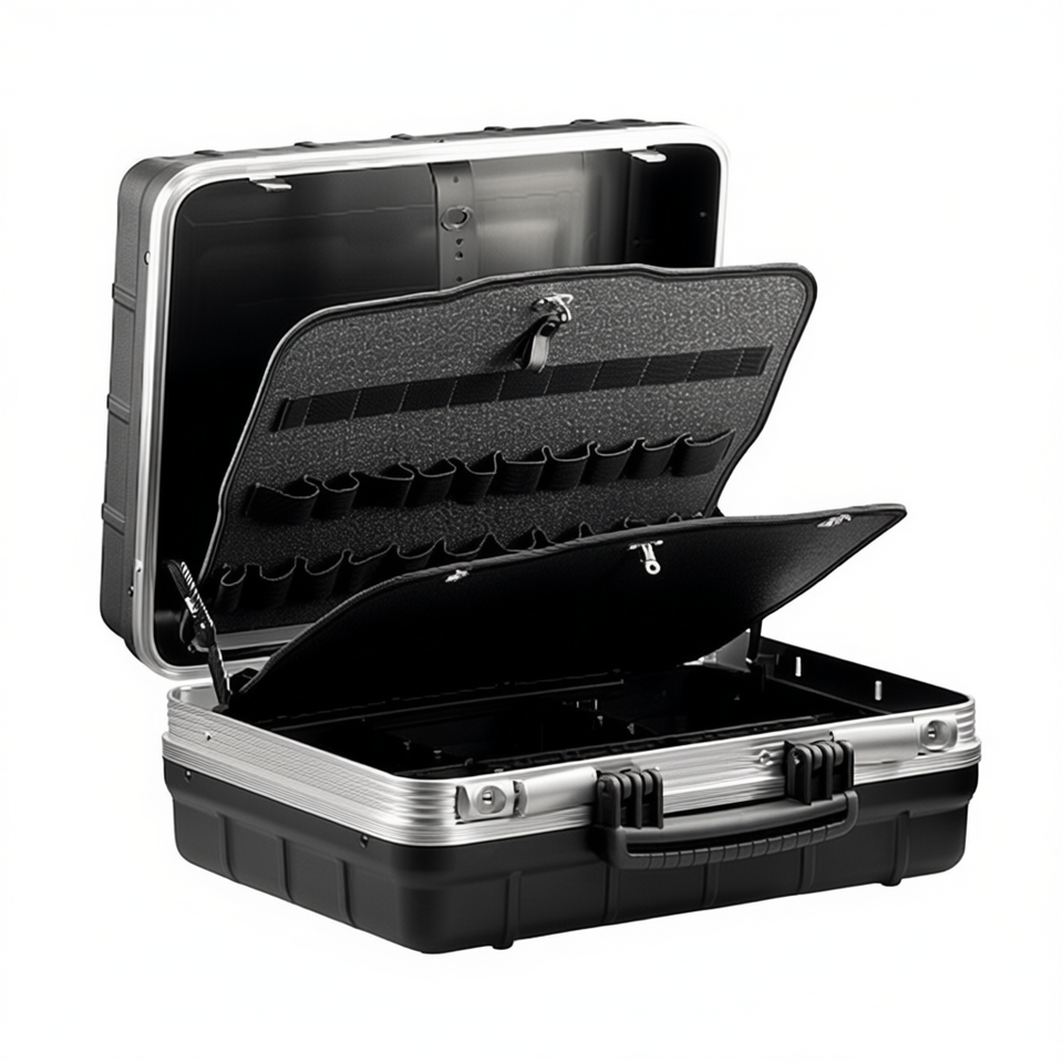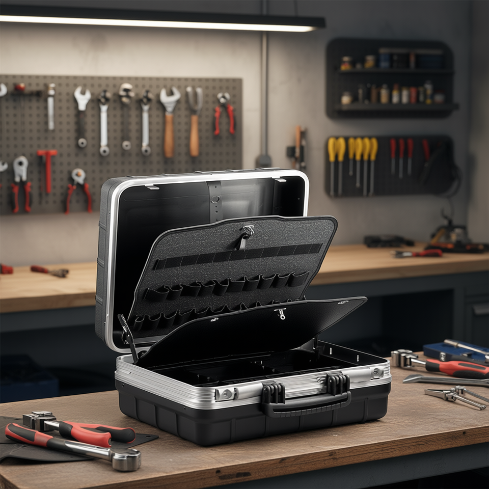 Boîte à outils avec insert en mousse et fermoirs verrouillables pour usage professionnel