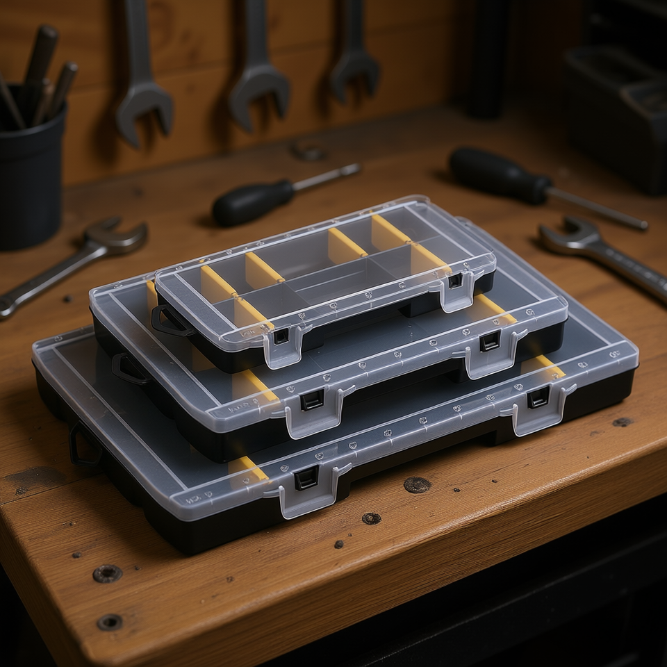 Boîte de rangement pour outils avec couvercle transparent et séparateurs pour utilisation dans un armoire à outils d'atelier