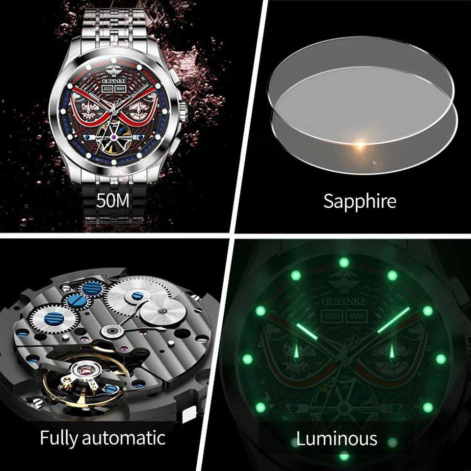 Top marque OUPINKE 3250 montre mécanique multifonction pour hommes squelette bracelet en acier inoxydable conception d'araignée étanche 2025