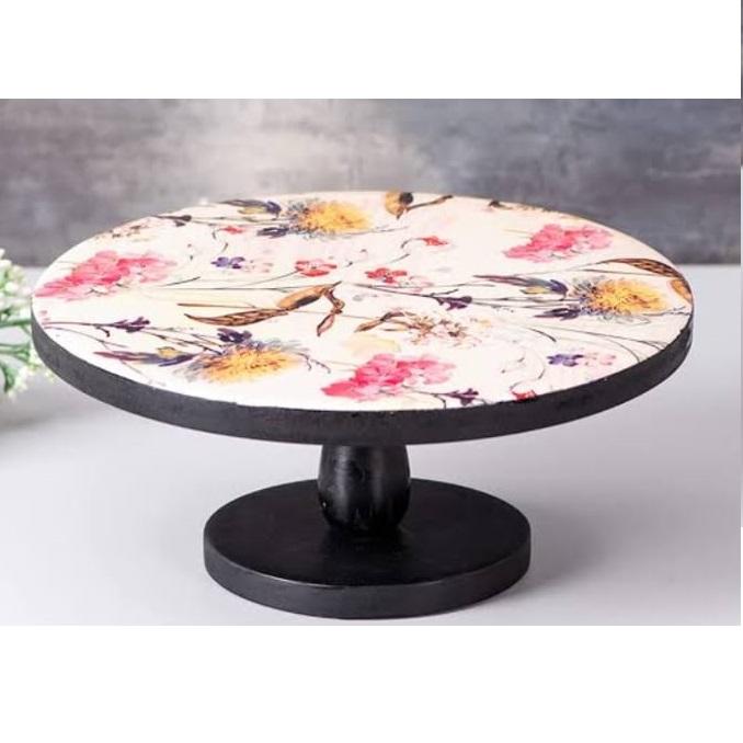 Support à gâteau décoratif artisanal en bois finition antique avec support métallique design pour présentation de gâteaux