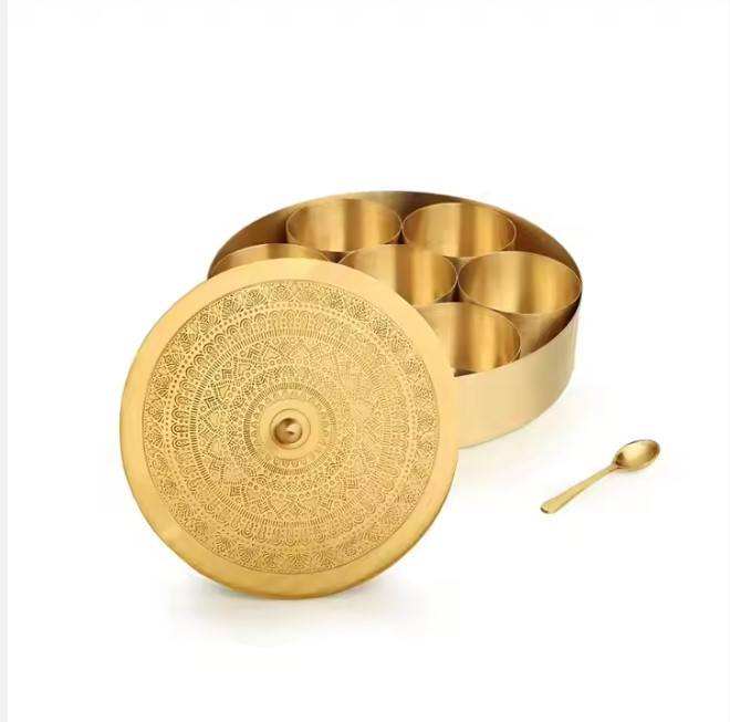 Boîte à épices en laiton artisanale de qualité supérieure, Masala Dabba, condiment, design artisanal, fournisseur de boîtes à épices en métal laiton
