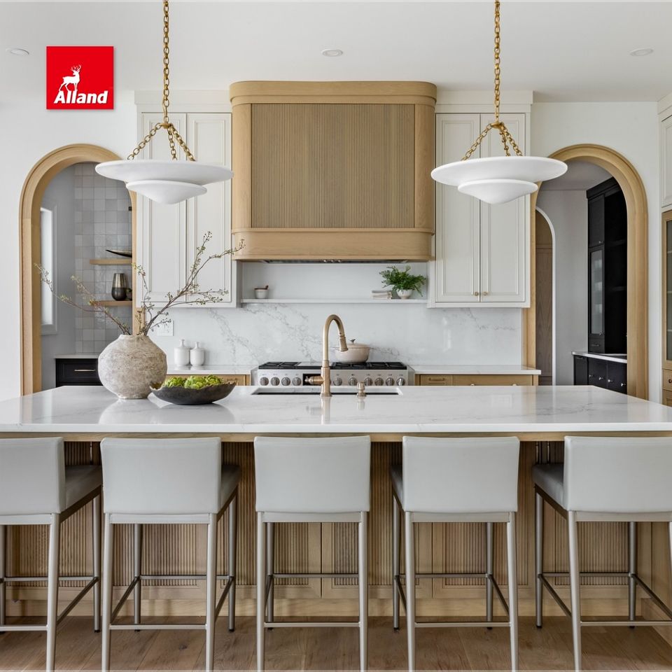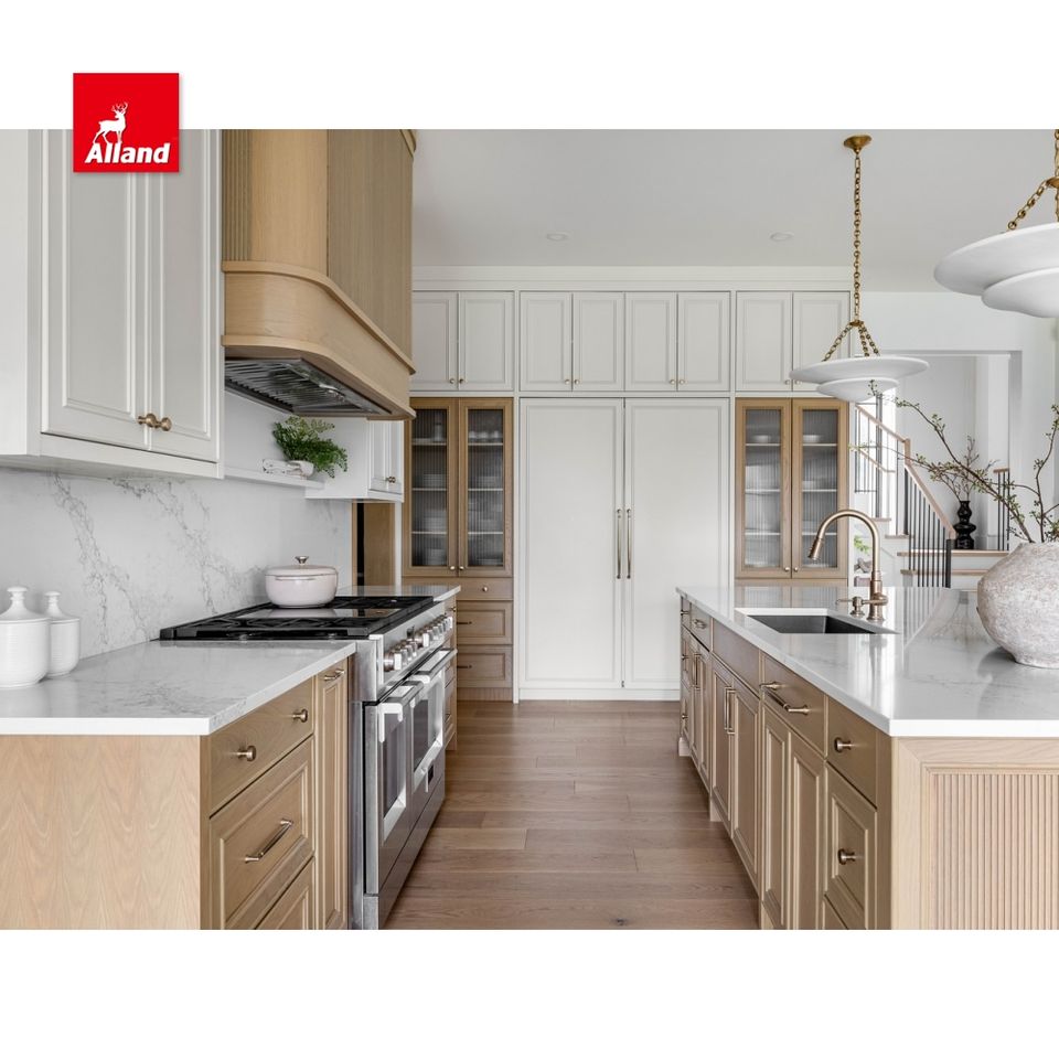 Tendances de la cuisine : armoires de cuisine en bois massif sur mesure de style transitionnel avec portes en verre strié, hotte aspirante striée, îlot strié