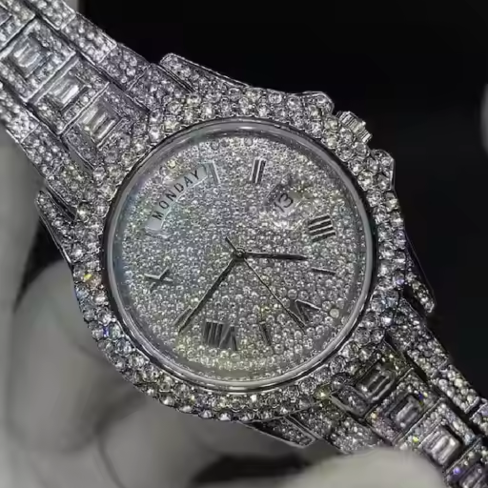Montre analogique à quartz de luxe haut de gamme en acier inoxydable entièrement sertie de diamants, affichage date et jour, chiffres romains, style hip-hop, mode et affaires