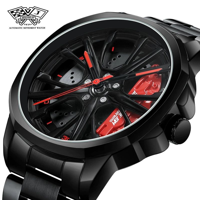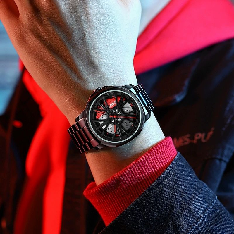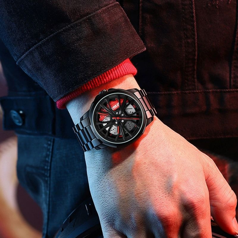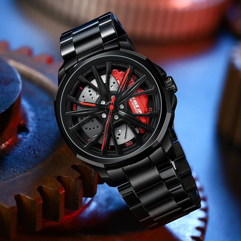 Montre à quartz pour homme, design moyeu de roue de voiture, impression personnalisée OEM, effet rotatif tridimensionnel, qualité supérieure, pour dropshipping