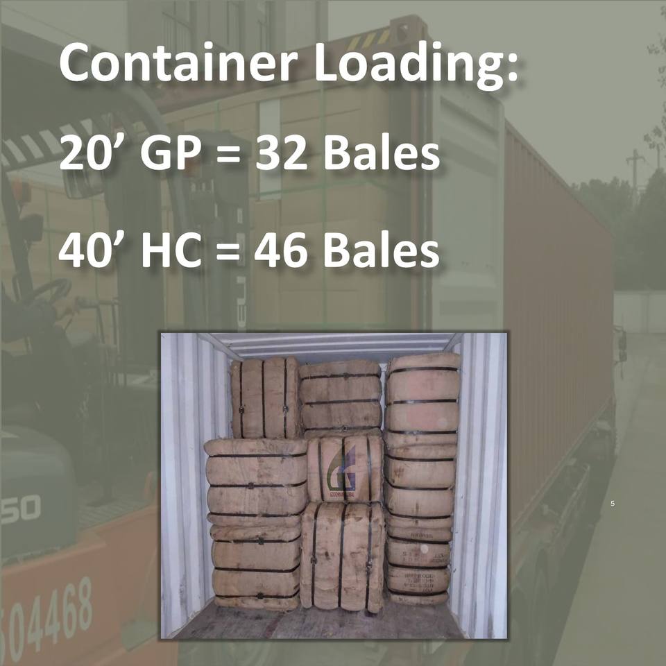 2000 yards/balle ; 32 balles par conteneur de 20 pieds ou 46 balles par conteneur HC de 40 pieds