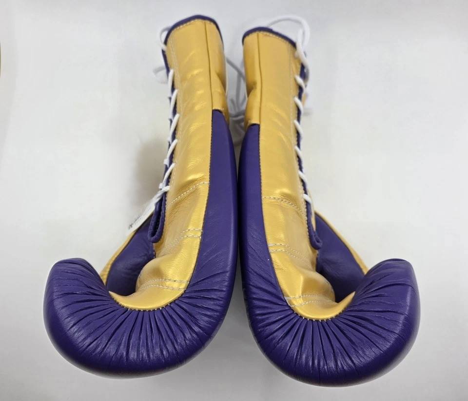Gants de boxe de qualité supérieure, confortables, respirants, sur mesure, couleur or violet, design à lacets, fabriqués en cuir véritable