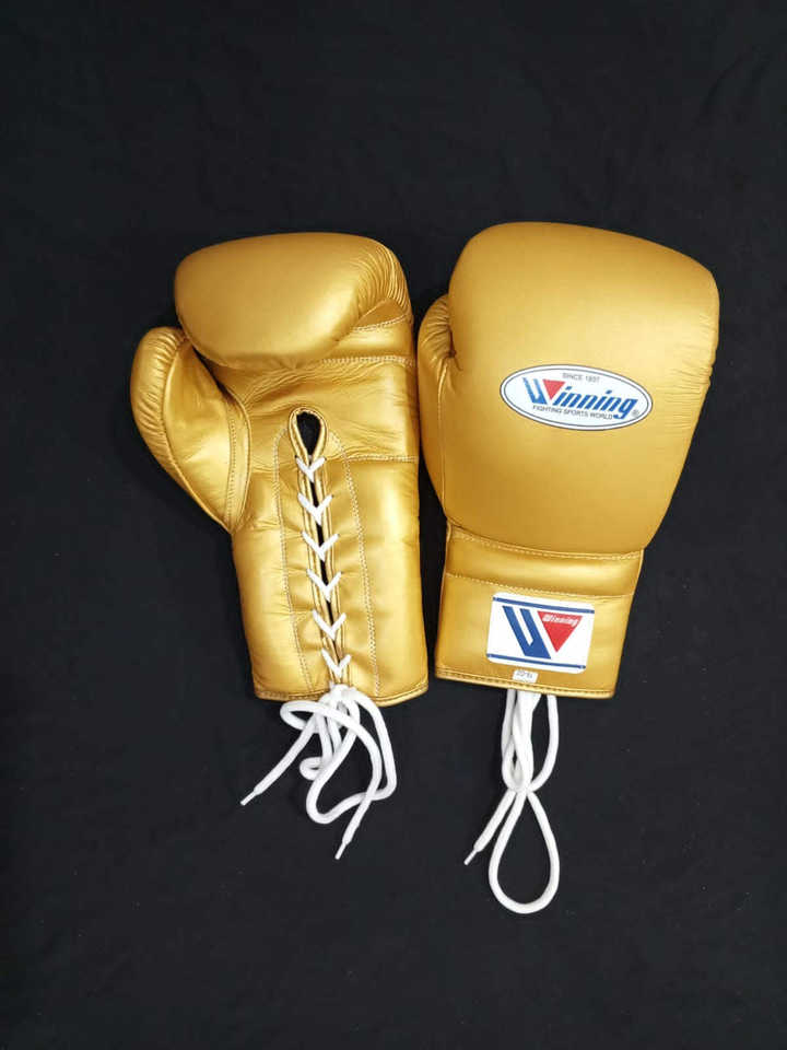 Gants de boxe de compétition de haute qualité, fabriqués sur mesure, à lacets, dorés, gagnants, 100% cuir véritable