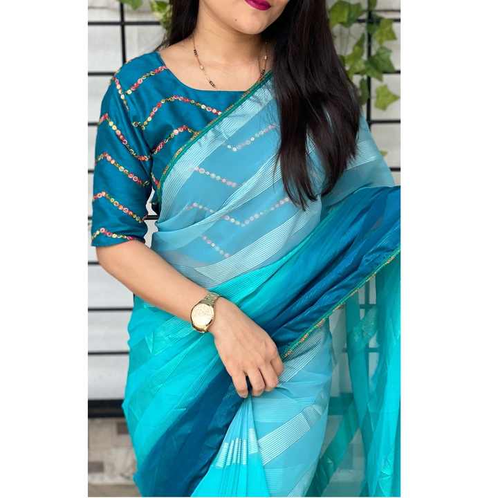 Sari en Georgette de Haute Qualité pour Soirée avec Imprimé Rembourré, Doublure et Bordure en Zari, avec Travail de Séquence et de Fil, Blouse