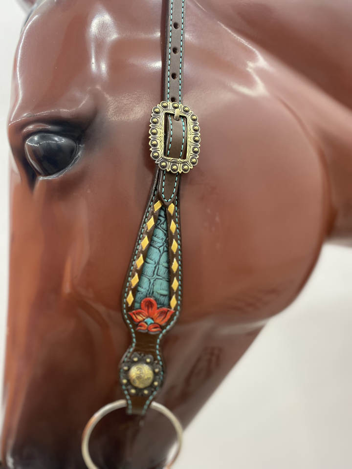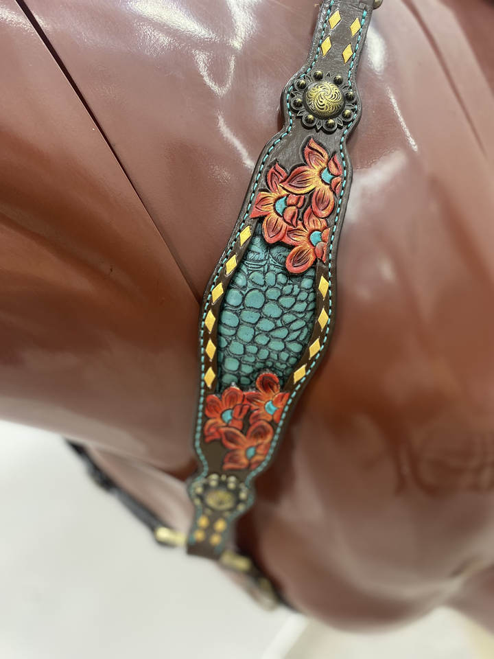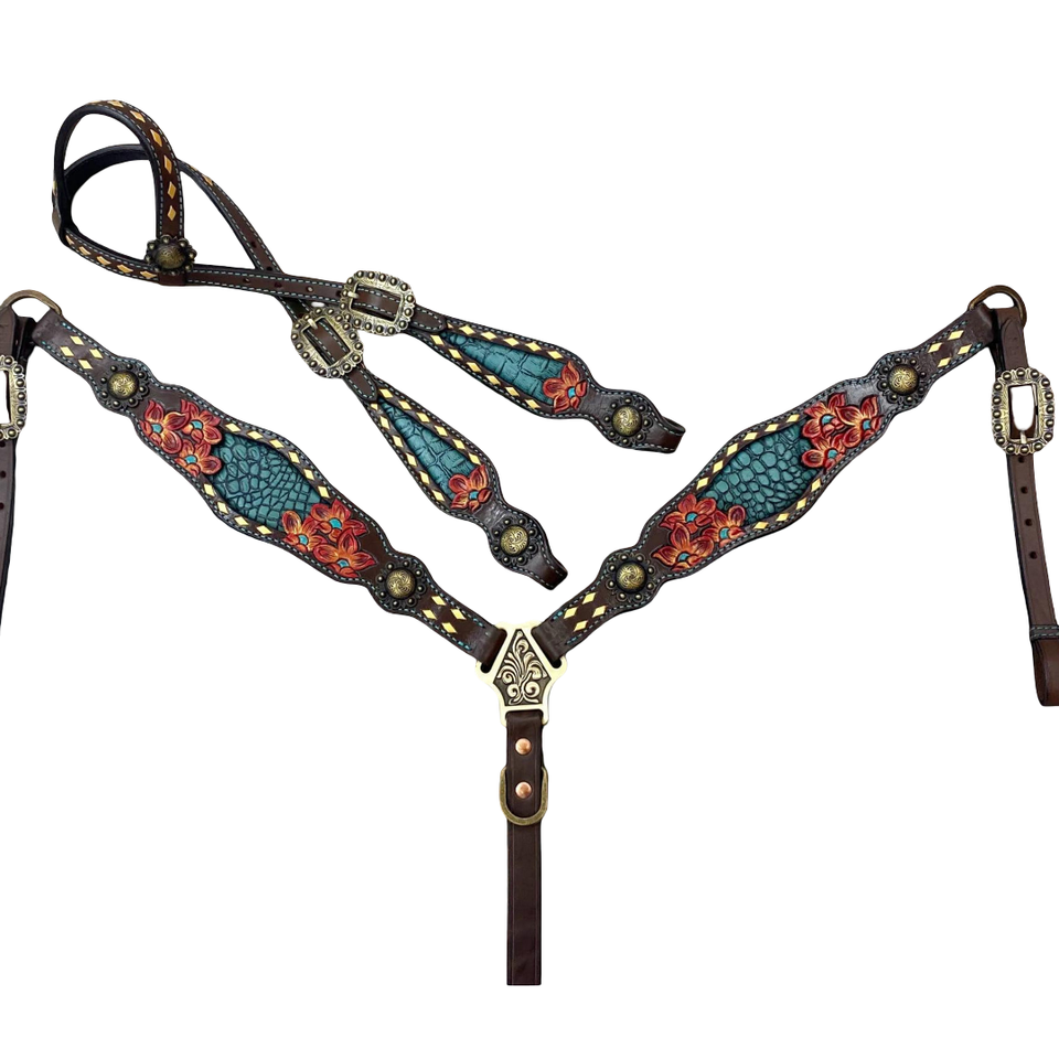 Top Quality Western Equestrian Horse Crocodile Skin Textured Cowhide Leather Headstall & Gladiator Breast Collar Roping Tack Set