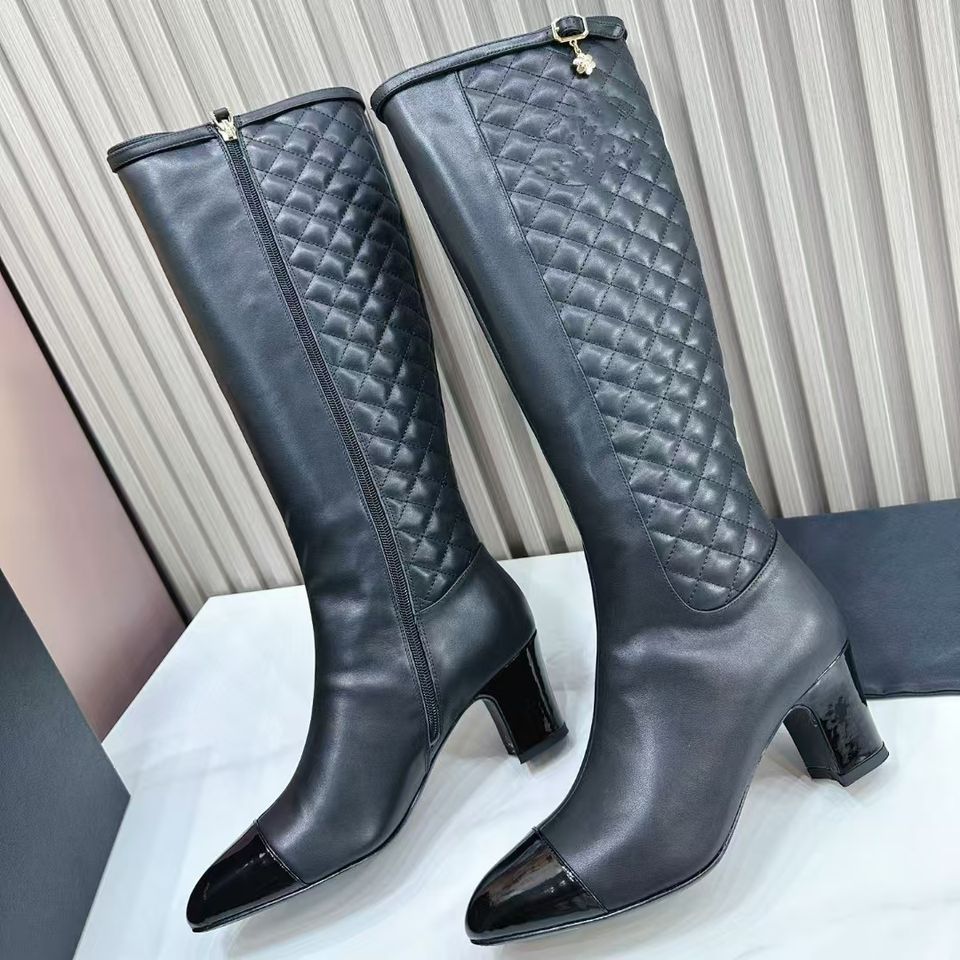 Top Quality Women Ladies Winter Autumn Chunky Heel 6.5cm Shoes Cowhide Leather Diamond Lattice Knee High Boots Women Luxury