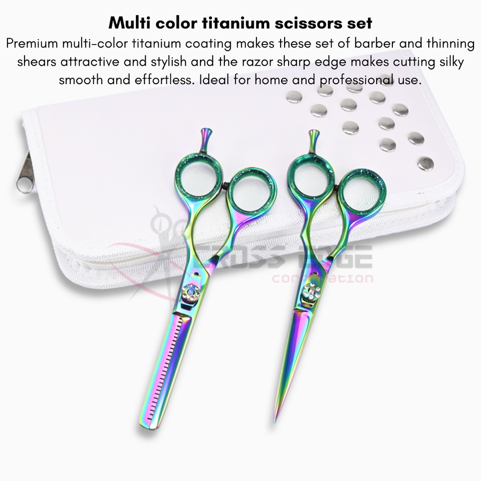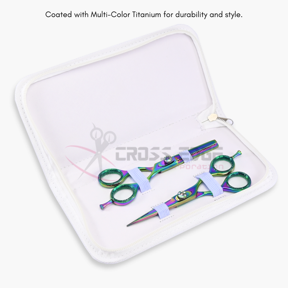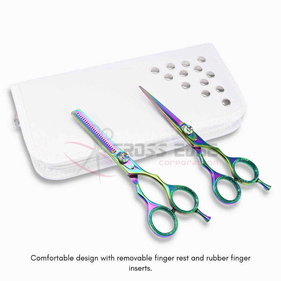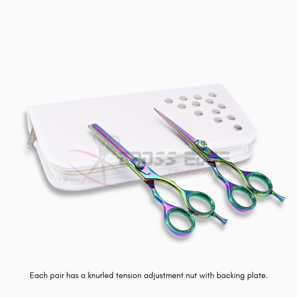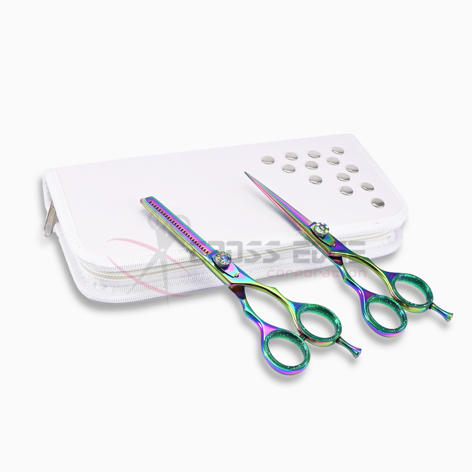 Ciseaux à cheveux arc-en-ciel de qualité supérieure et ensemble de ciseaux à effiler avec étui blanc, en acier inoxydable de haute qualité, couleur personnalisable