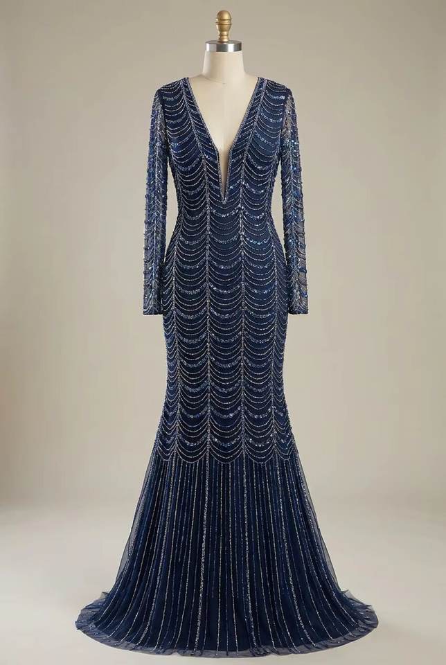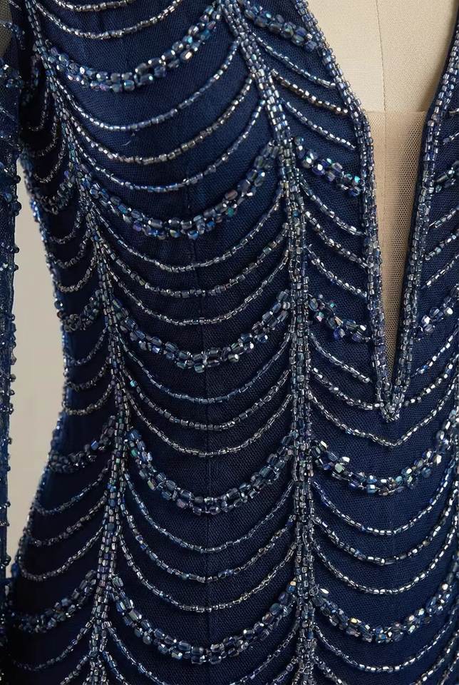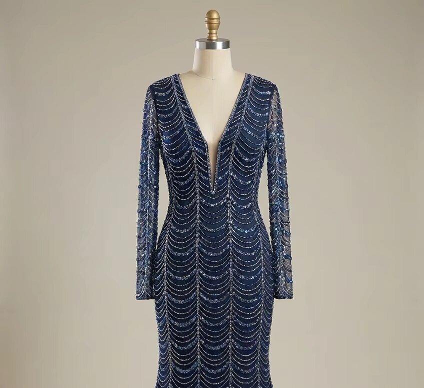 Robe de soirée sirène bleu marine faite main, ornée de sequins et de perles, col en V profond, la plus vendue – Fournisseur