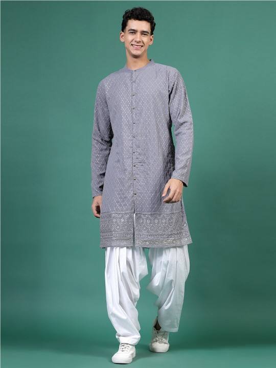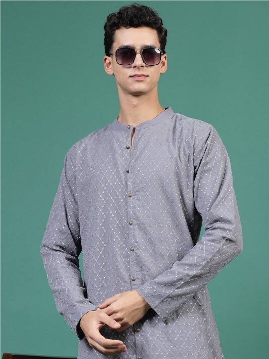 Top vente de haute qualité Kurta géométrique brodé paillettes Mandarin col Georgette Kurta ensemble pour hommes au prix de gros