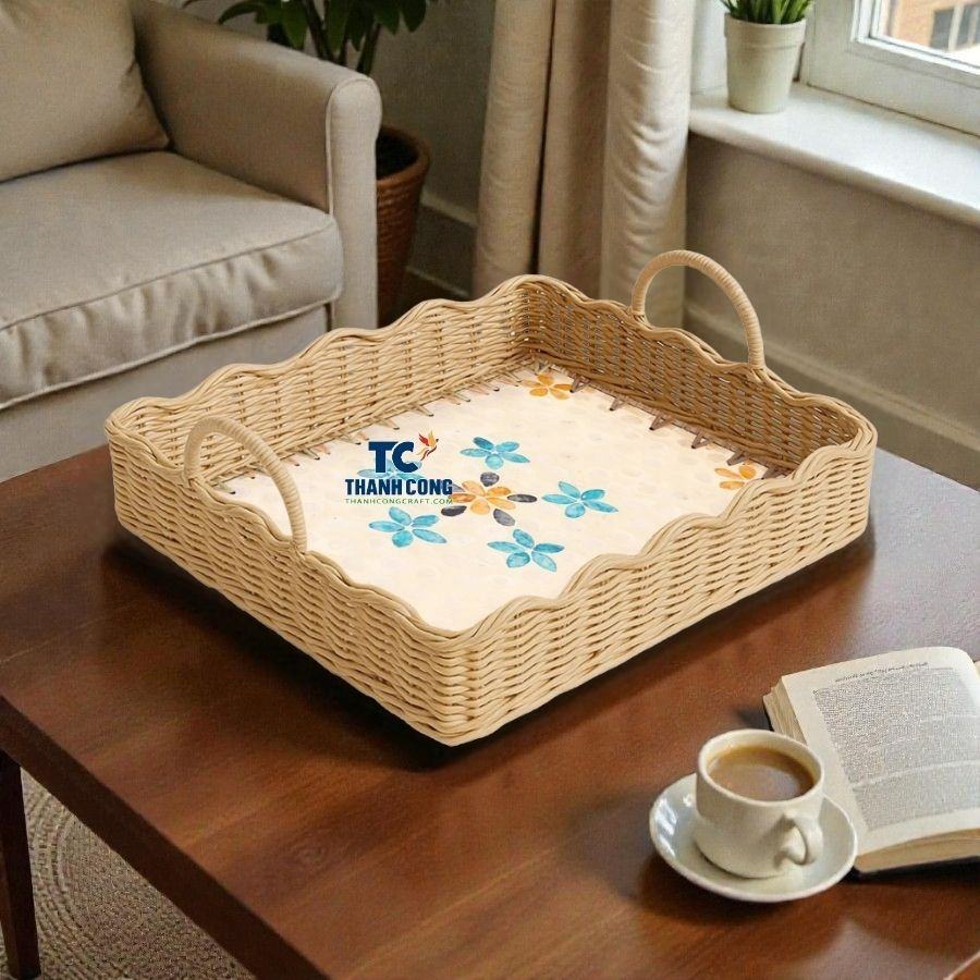 Plateau à deux niveaux en rotin et nacre festonnée, artisanat haut de gamme pour la décoration du salon, utilisation pour les boissons, incrustation de perles