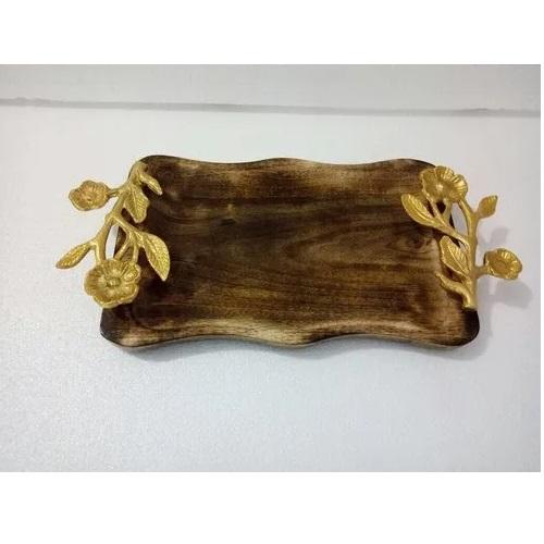 Plateau de service en bois fait à la main, plateau rond de forme ovale avec poignée en métal de fleur d'or pour le prix de gros