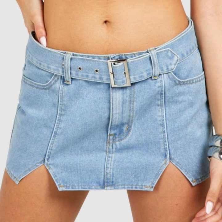 Jupe en jean mini taille basse Y2K la plus vendue avec ceinture et découpe avant, bleu clair, pour femme