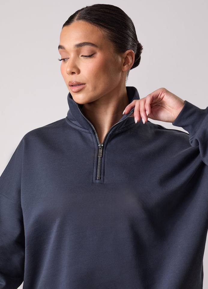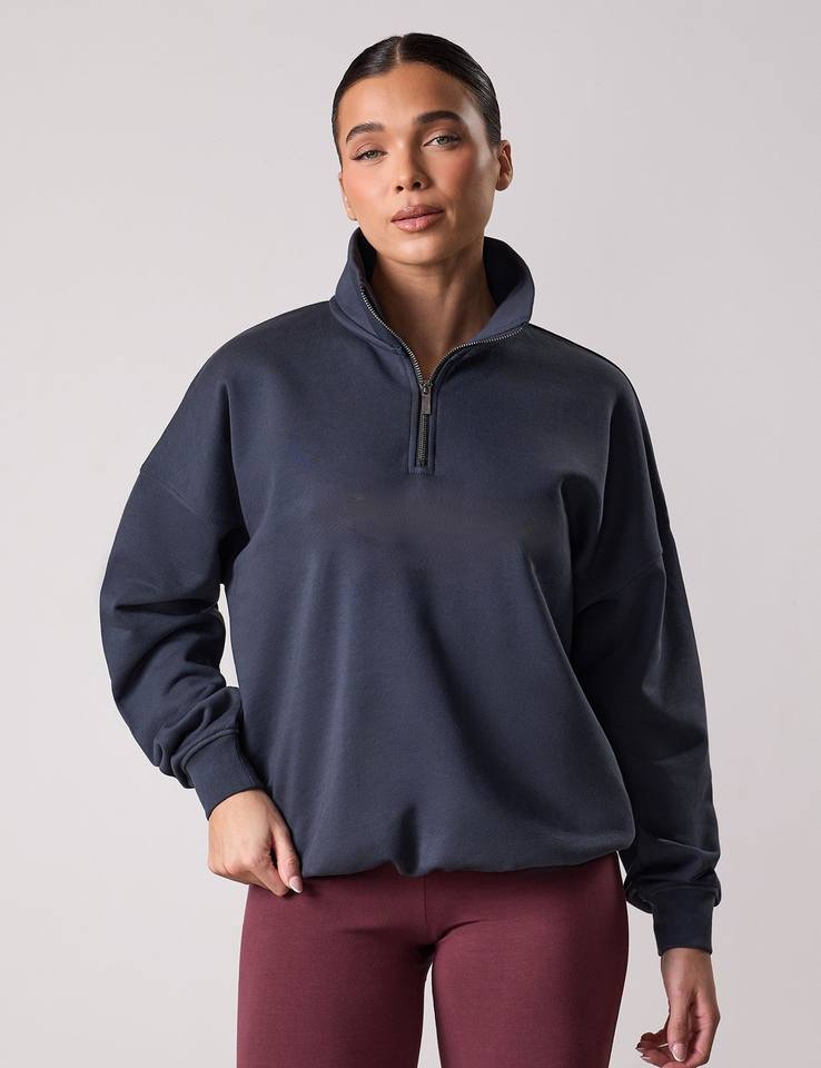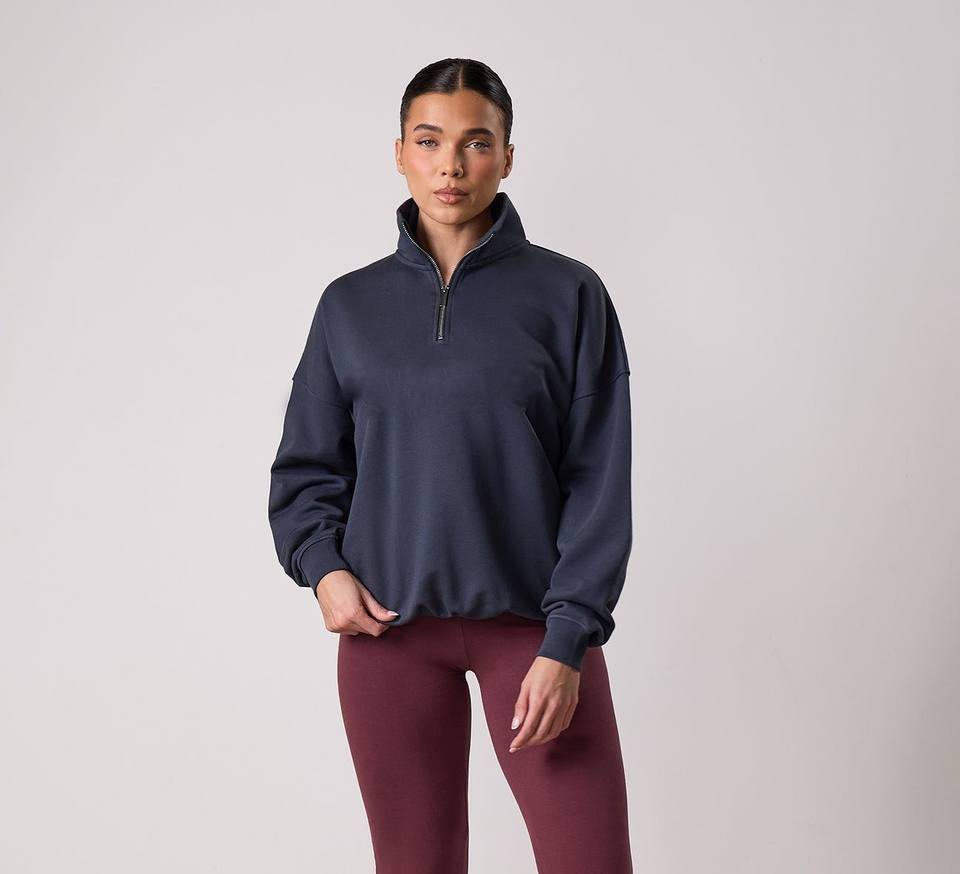 Sweat-shirts d'hiver pour femmes à col rond, style tendance, coupe ample, épaules tombantes, manches longues, couleur unie, fermeture éclair mi-longue
