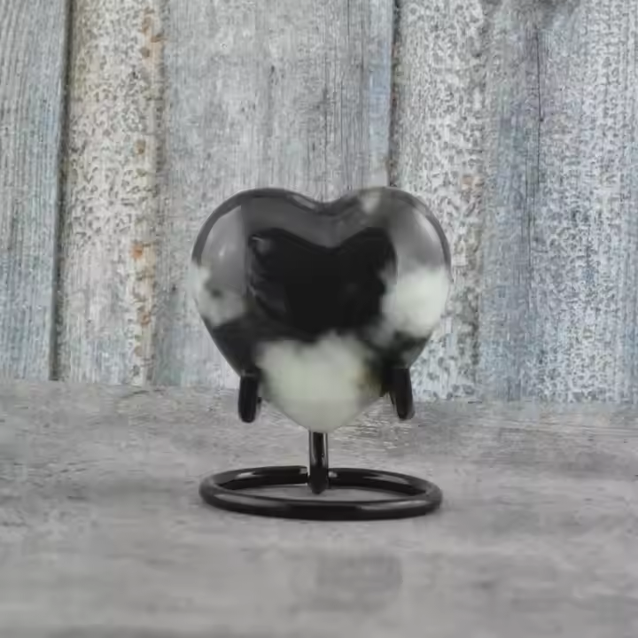 Support de cœur de souvenir haut de gamme avec plusieurs motifs de cœur gravés avec une urne de crémation recouverte d'étain et peinte en noir