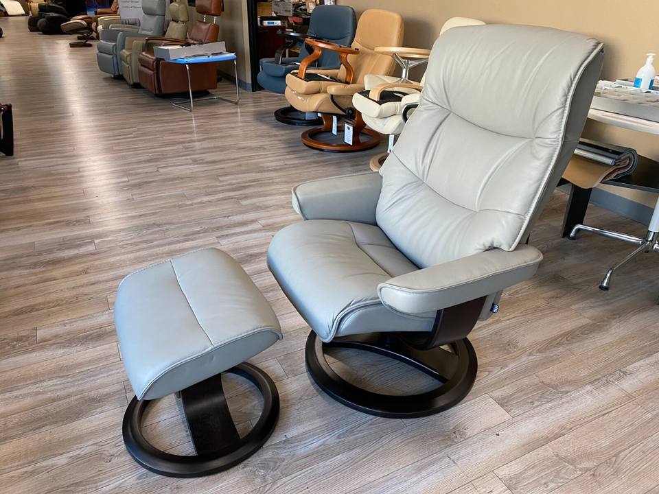Fauteuil inclinable nordique I-M-G très demandé + repose-pieds - Cuir gris tendance - Ciseaux à cheveux en bois expresso