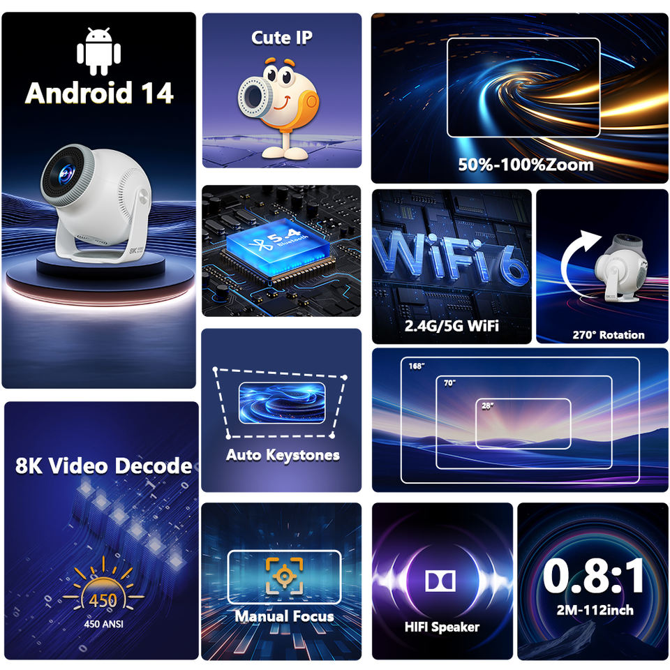 Topleo Hy300 Pro vidéoprojecteur LED 720p natif Allwinner H726, Android 14+Linux, 8GB ROM/1GB RAM, 450 ANSI lm, Wi‑Fi6+BT5.4