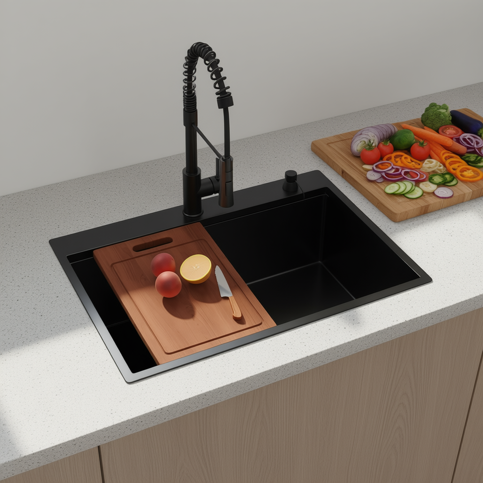 Évier de cuisine encastré 30 pouces, cuve simple, en acier inoxydable 18 gauge, noir canon de fusil, avec robinet