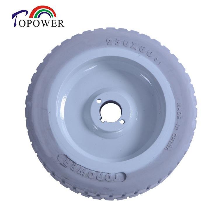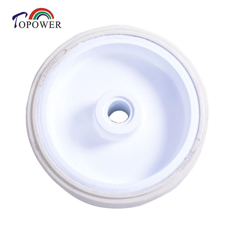 Roue pivotante robuste en fonte et aluminium Topower 15x5 avec bande de roulement ferme, fixation par boulons, frein latéral, usage industriel durable
