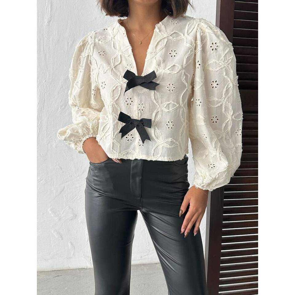 Topshow Women's Blouses & Shirts Wholesale Lace Blouse with Elegant Stone Bow Detail