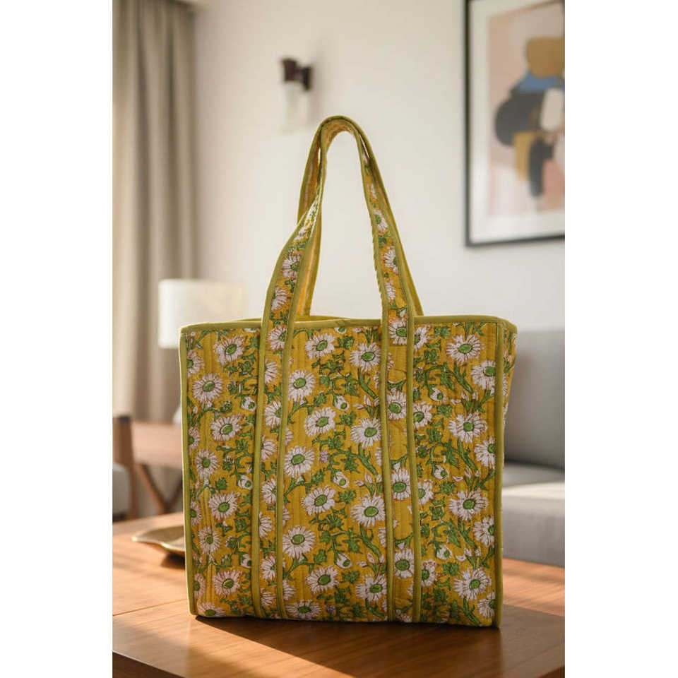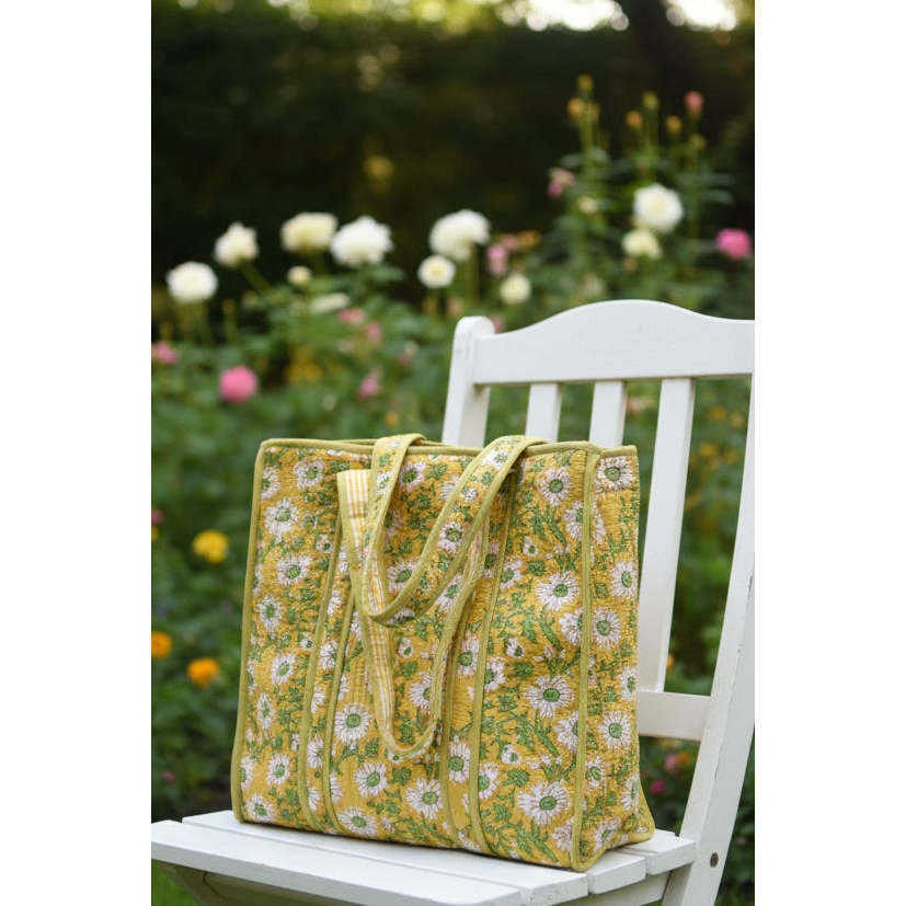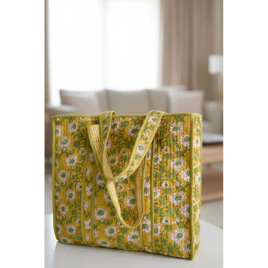 Sac fourre-tout surdimensionné en coton jaune uni, style bohème, avec motifs brodés à la main, fermeture ouverte, RAJASTHANI TEXTILE Rajasthan