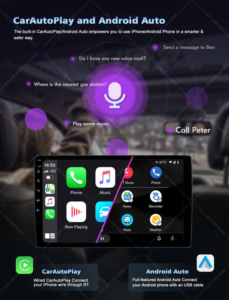 Chargeur de Voiture, Lecture, Mains-libre, Amplificateur, DSP, CarPlay, Lien de miroir, Android auto, Charge rapide, Contrôle de l'application, Lumières colorées, Commande au Volant, L'assistant vocalFonction
