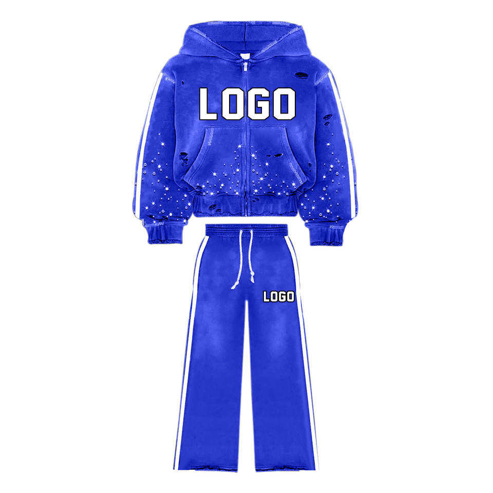 Tracksuit New Men's Distressed Acid Wash Breathable Zip-Up 2pc Stacked Jogger French Terry Hoodie Sweatpants Set Heavyweight