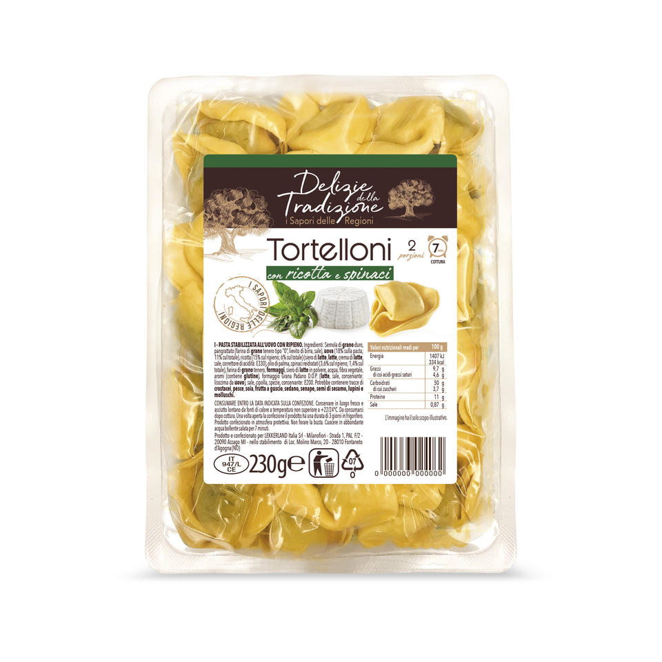Tortelloni Traditionnels aux Épinards et Ricotta 230g x 14 pièces, Forme Spéciale, Cuisson en 7 Minutes, Ingrédient Principal : Blé Dur Italien
