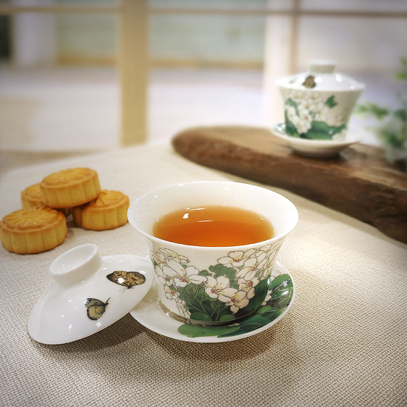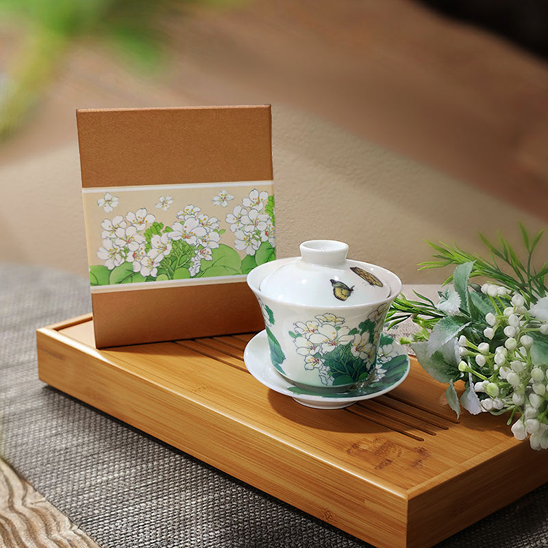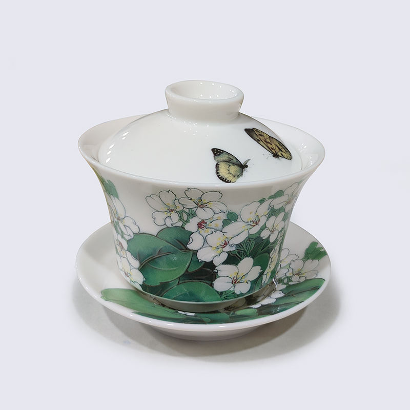 Tasse à thé Gaiwan en céramique traditionnelle chinoise avec fleur de tung et art papillon
